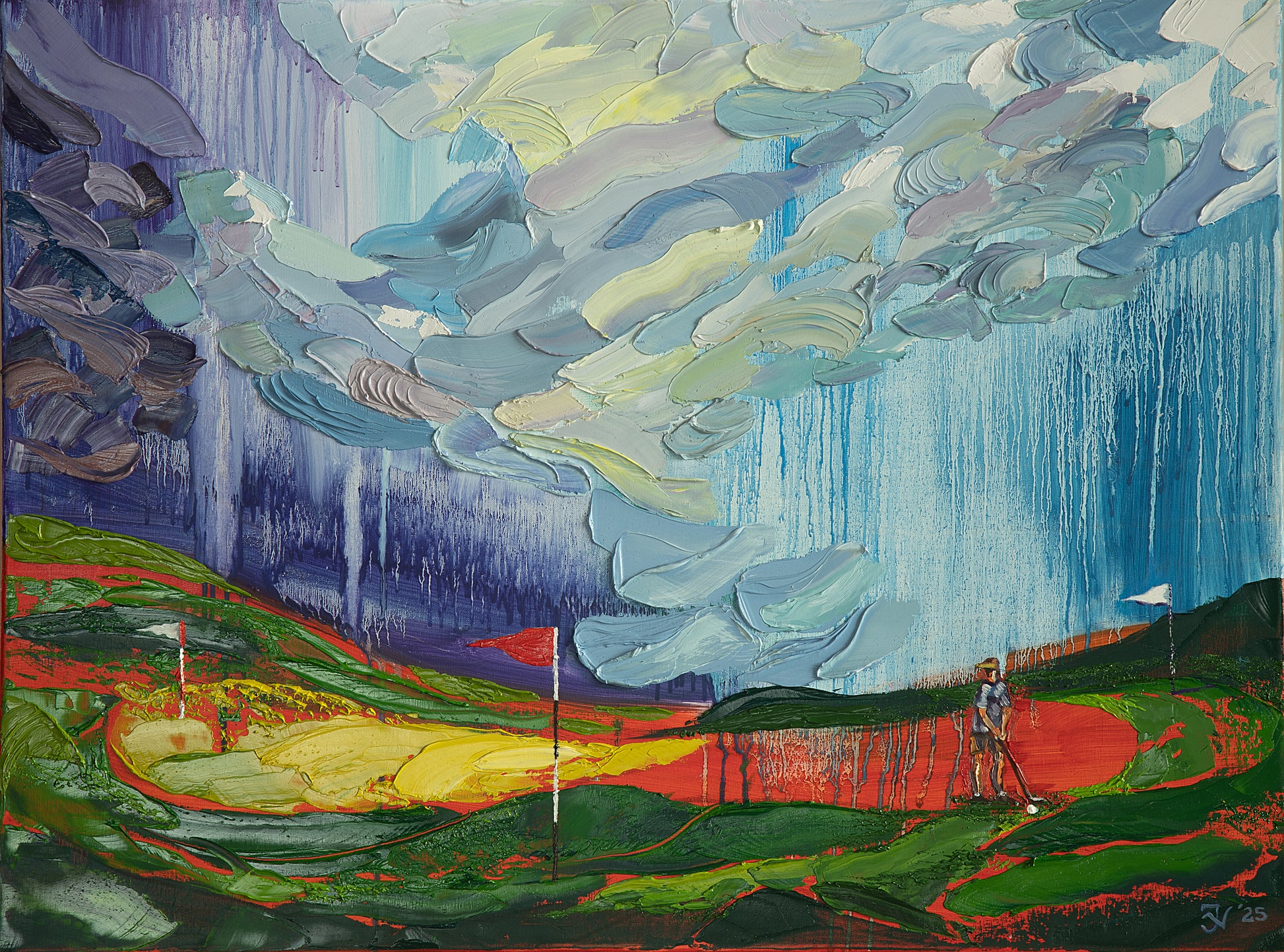 The painting captures the moment of tension before the rain. The sky is covered with heavy clouds, their movement echoing the rhythm of the approaching storm. Against the vivid golf landscape stands a player preparing for a shot - calm yet filled with inner strength. The stillness before the downpour becomes a metaphor for balance between man and nature.