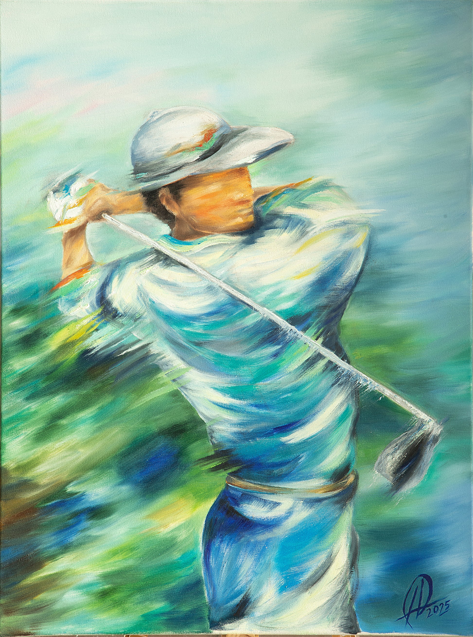 The painting explores the connection between movement and emotion. Its title, “eMotion,” plays on the words emotion and motion, reflecting the unity of body and mind. The golfer is portrayed in the moment where focus and flow merge into a single current of energy.