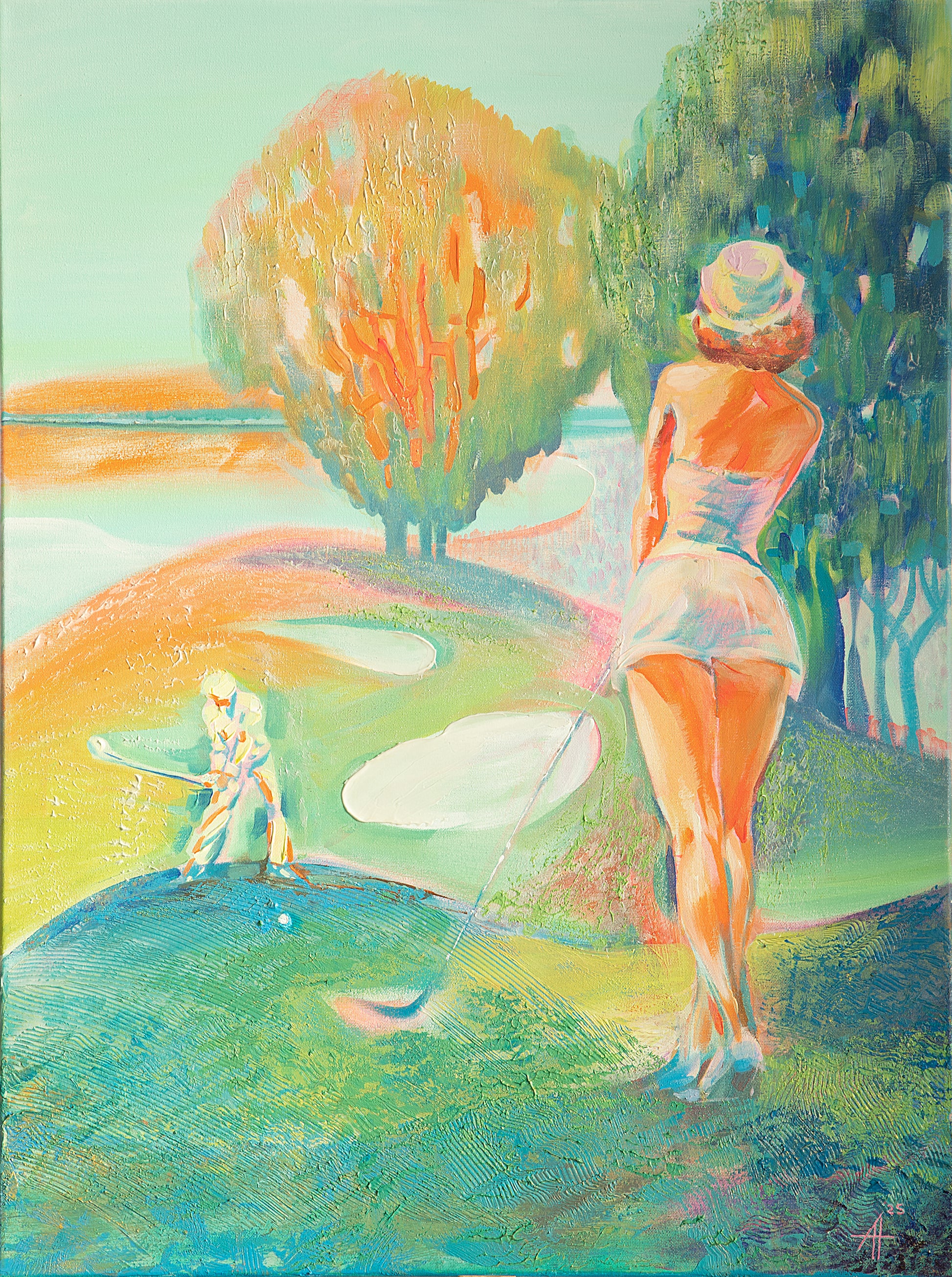 “Happy Times” portrays a golf course bathed in the golden light of a summer evening. A tanned woman watches as a golfer prepares to take his shot. The tension of the moment is heightened by vivid, idealized colors that lend the scene a dreamlike, almost cinematic quality.