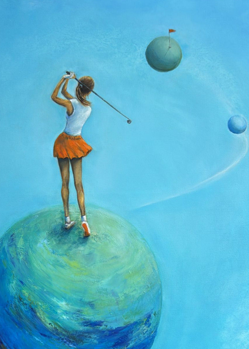 This painting is a manifesto of freedom, courage, and the desire to go beyond boundaries. The artist places the golfer not on a familiar field but on the surface of a planet, turning the game of golf into a symbol of launching intention that travels into the universe. Light brushstrokes and the purity of sky tones create a sense of infinity, where each swing becomes an act of creation.