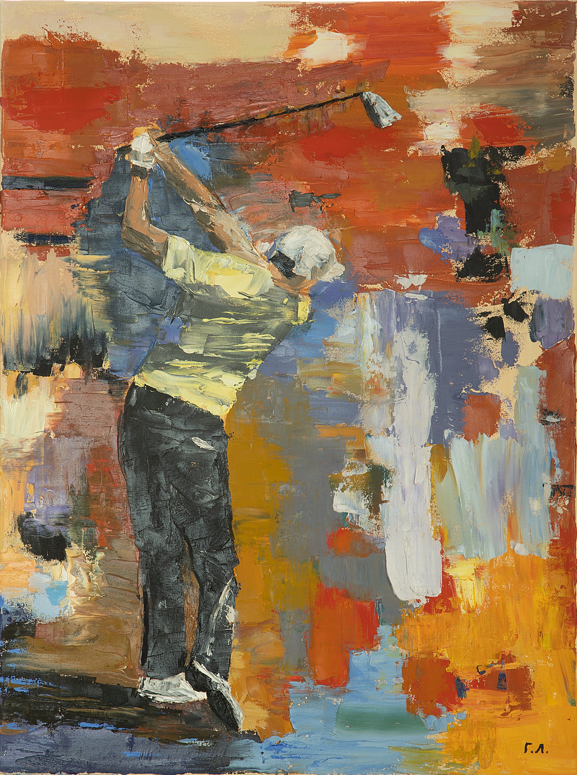 “Moment” captures the highest point of focus - the breath before the swing. In this suspended instant, calm and tension merge into one pulse. The golfer becomes the epicenter of energy, where motion is just about to be born. Through expressive brushwork and powerful contrasts of color, the artist reveals the inner explosion that has not yet happened, yet already fills the space with vitality and strength.
