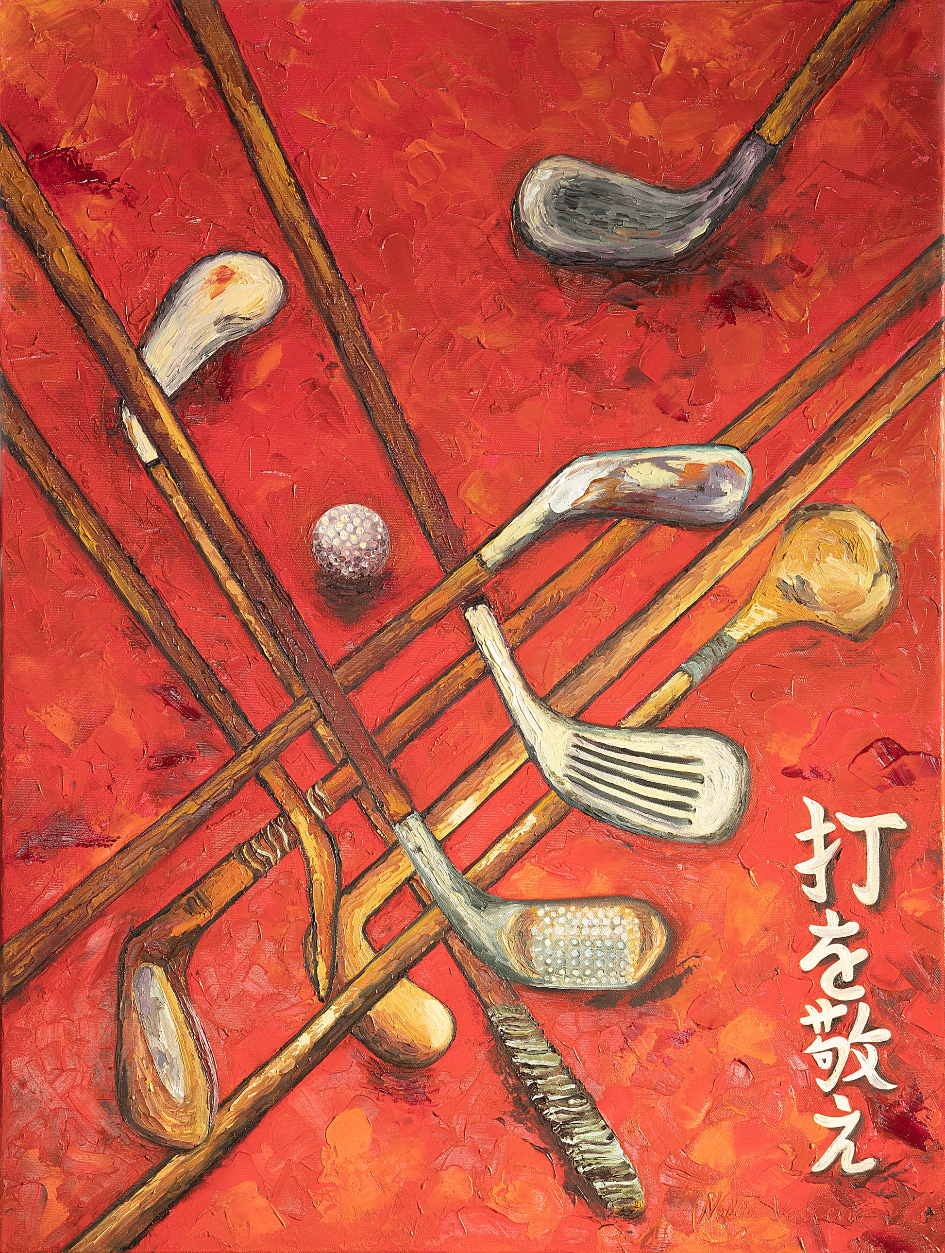 The Japanese characters written on the right are translated as “Respect the Shot” or “Show Respect in the Game.” This phrase emphasizes the idea of golf as an honest, respectful competition, where what matters is not only technique but also one’s attitude toward the opponent and the process itself.