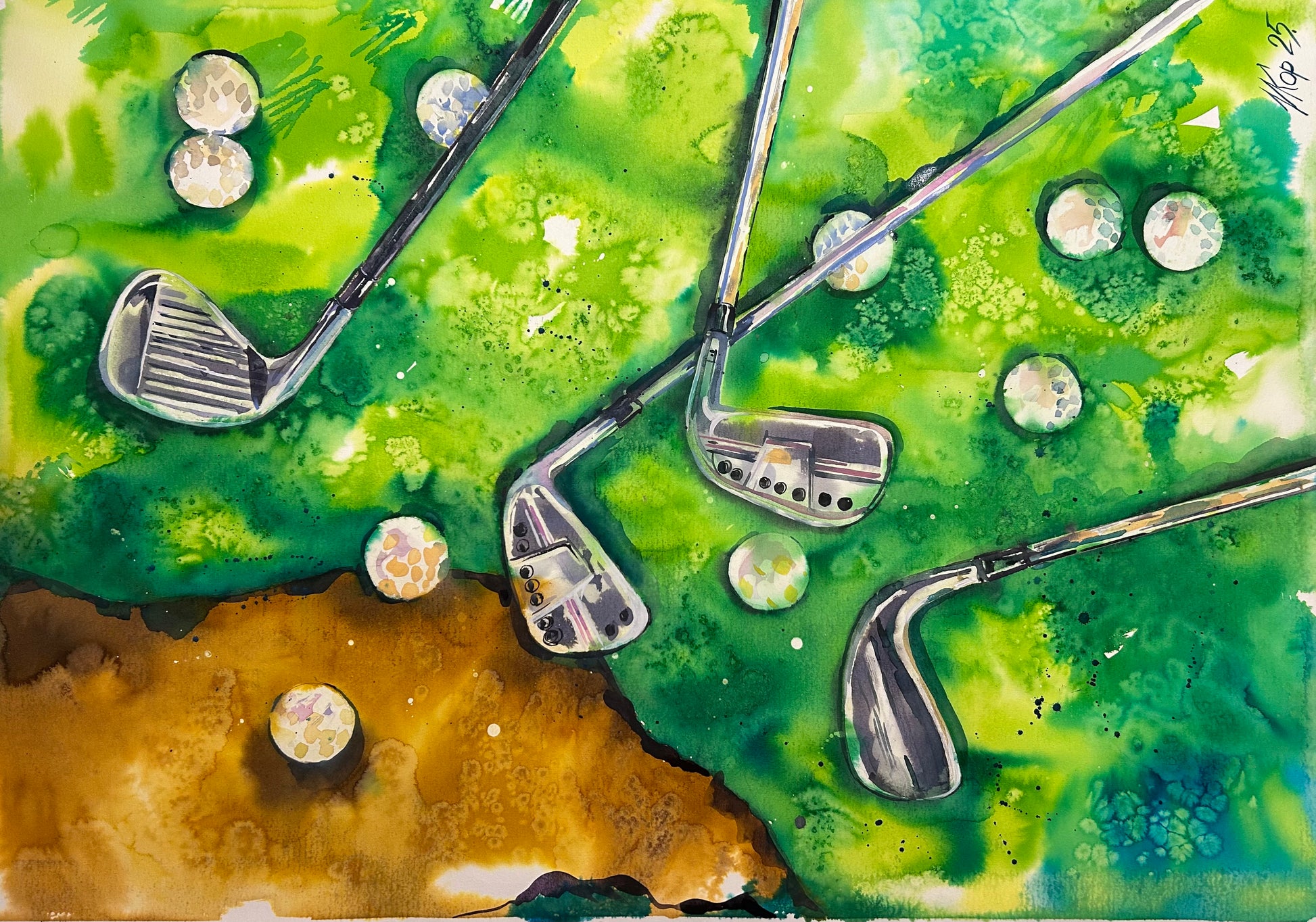 Golf is becoming increasingly popular in Latvia. This work captures the joy and rhythm of summer - the unity of movement, nature, and play. The freshness of colour and transparency of watercolor convey lightness and energy, while the composition of clubs and balls evokes a bright day full of vitality and sunshine.